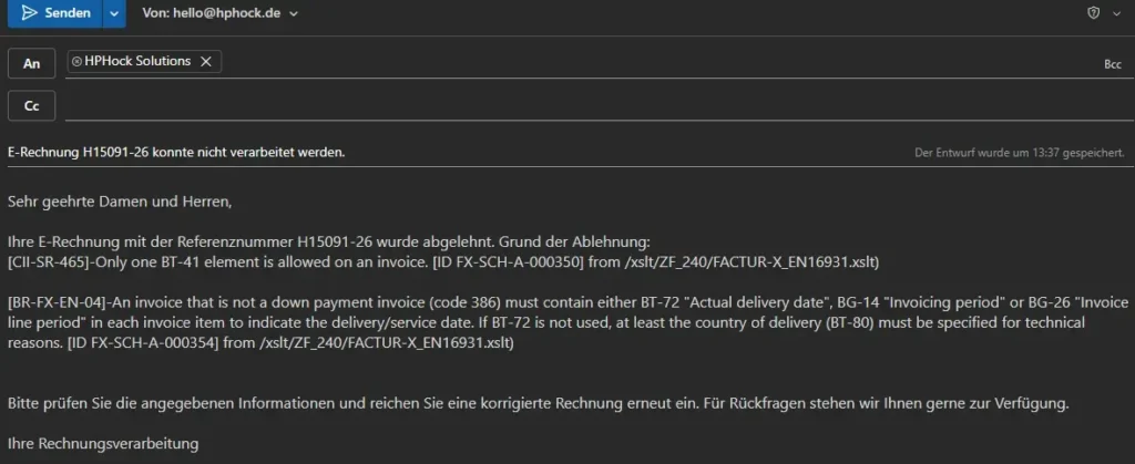 - Empfänger: Die im Dokument hinterlegte E-Mail des Rechnungsstellers.