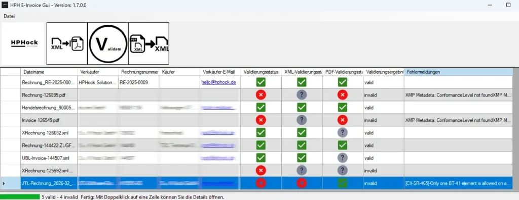 Die korrekte Validierung von E-Rechnungen ist essenziell, um steuerliche Anforderungen zu erfüllen und reibungslose Zahlungsabläufe zu garantieren. Mit der hph.EInvoice.Gui stellen wir Ihnen ein mächtiges Werkzeug zur Verfügung, das XML- und PDF-basierte E-Rechnungen in Sekundenschnelle prüft.