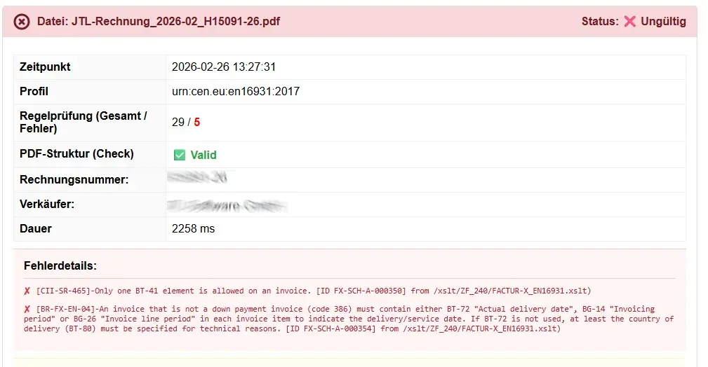 Hier werden Ihnen die spezifischen Fehlermeldungen (z. B. fehlende Pflichtfelder wie das Leistungsdatum oder Verstöße gegen Geschäftsregeln wie BT-41) im Klartext angezeigt. Dies hilft Ihnen, Fehler schnell zu identifizieren und an den Ersteller zu kommunizieren.